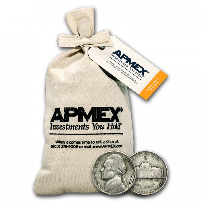 Any quantity only $2.99 per oz over spot Each Silver War Nickel $50 Face Value Bag contains coins with a composition of 35% Silver, 56% copper and 9% manganese.