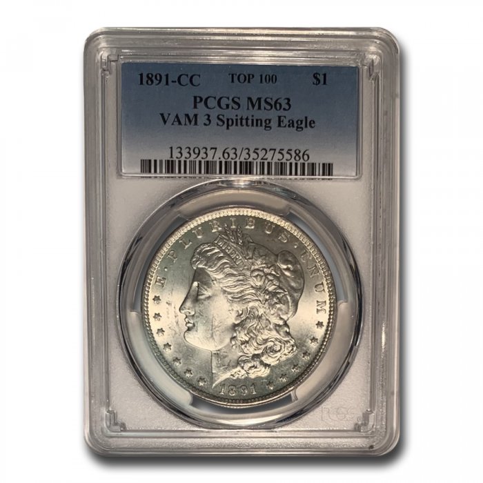 This 1891-CC Morgan Dollar (VAM 3 Spitting Eagle) has been certified as MS-63 by PCGS, one of the top two coin grading services. This coin has a population of only 241 coins!