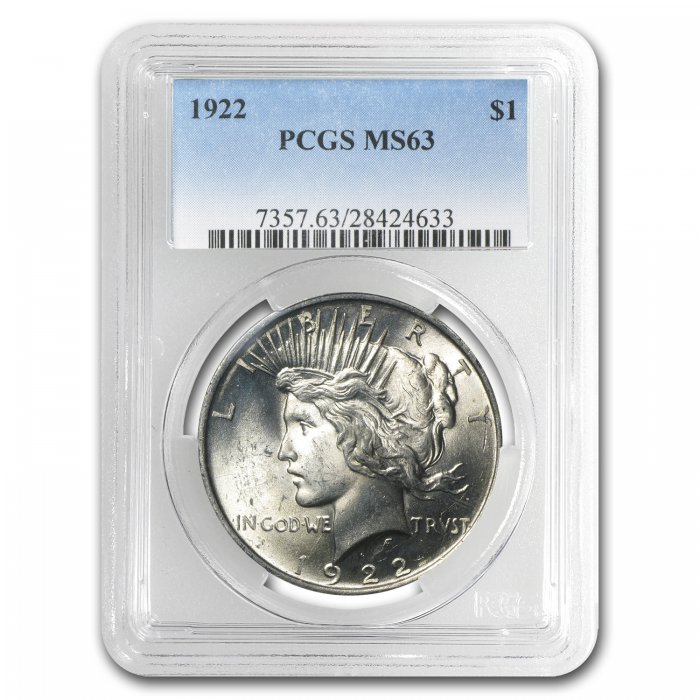 The Peace Dollar was created to symbolize the peace after WWI. This 1922 Peace Dollar is graded and guaranteed as an MS-63 by PCGS and encapsulated in a sealed holder to protect your investment.