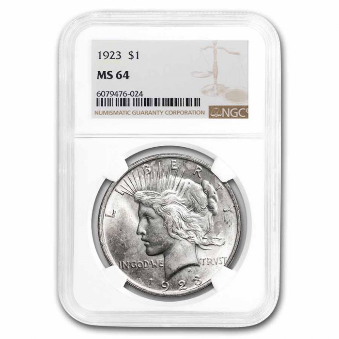 The Peace Silver Dollar was created to symbolize peace after World War I. This 1923 Peace Dollar has been guaranteed an MS-64 by NGC, one of the top two coin grading services.