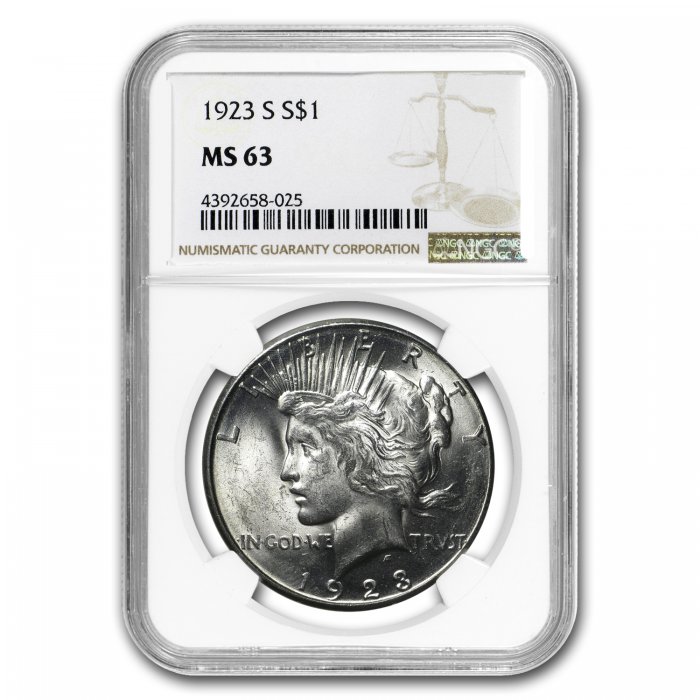 Used as currency nearly a century ago, Peace Silver Dollars were minted to commemorate peace after WWI. This 1923-S Peace Dollar has been graded an MS-63 by NGC, a top coin grading service.