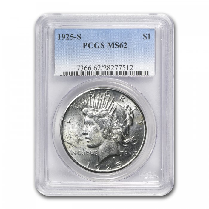 The Peace Dollar was created to symbolize peace after World War I with a beautiful design by Anthony de Francisci that makes the Peace Dollar highly collectible. This issue has been graded an MS-62 by PCGS, one of the top coin grading services.