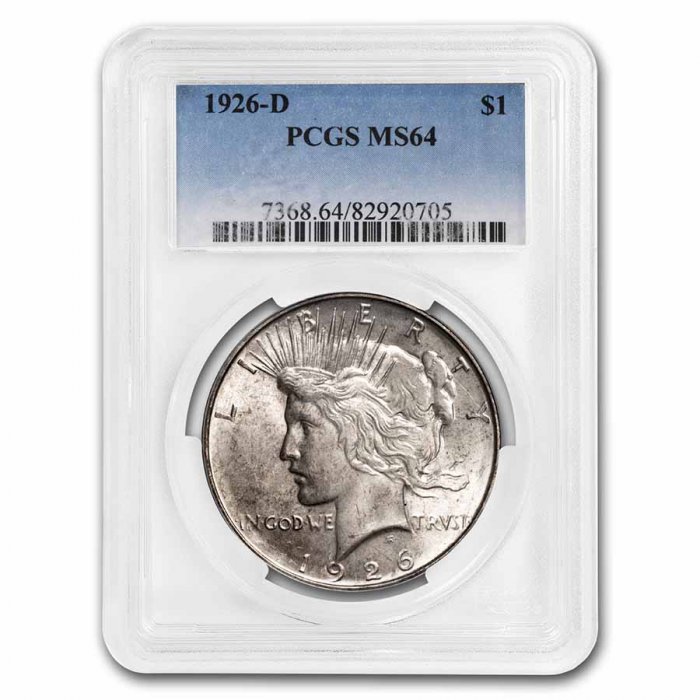 This 1926-D Peace Dollar has been certified as MS-64 by PCGS, one of the top two coin grading services. This highly collectible coin is a great addition to any numismatic collection!