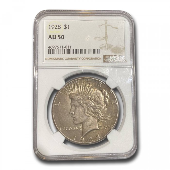 One of the key dates in this popular series due to its exceptionally low mintage, this 1928 Peace Dollar has been certified AU-50 by NGC.