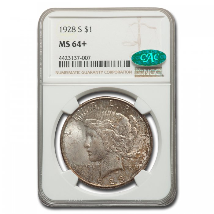 This 1928-S Peace Dollar has been certified as MS-64+ by NGC, one of the top two coin grading services. This coin has a population of only 65 coins!