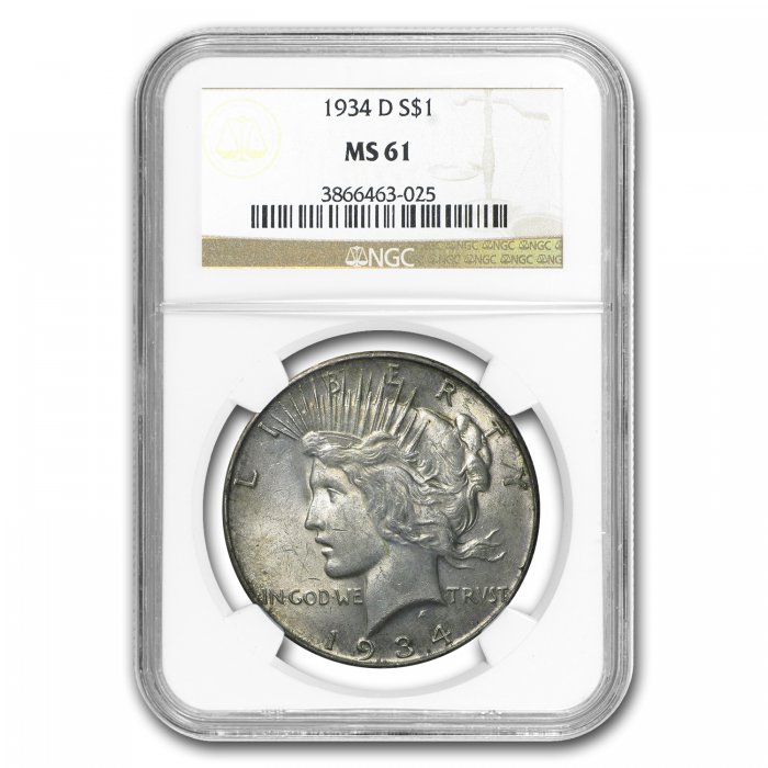 This 1934-D Peace Dollar has been certified as MS-61 by NGC, one of the top two coin grading services. This highly collectible coin is a great addition to any numismatic collection!