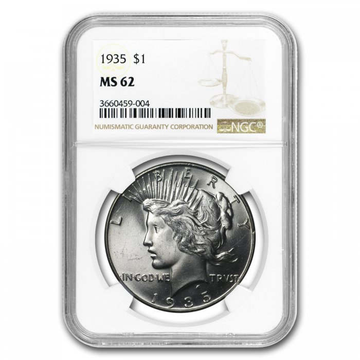 The Peace Dollar was the popular follow-up design to the Morgan Dollar. This example has been certified an MS-62 by NGC, one of the top coin grading services in the world.
