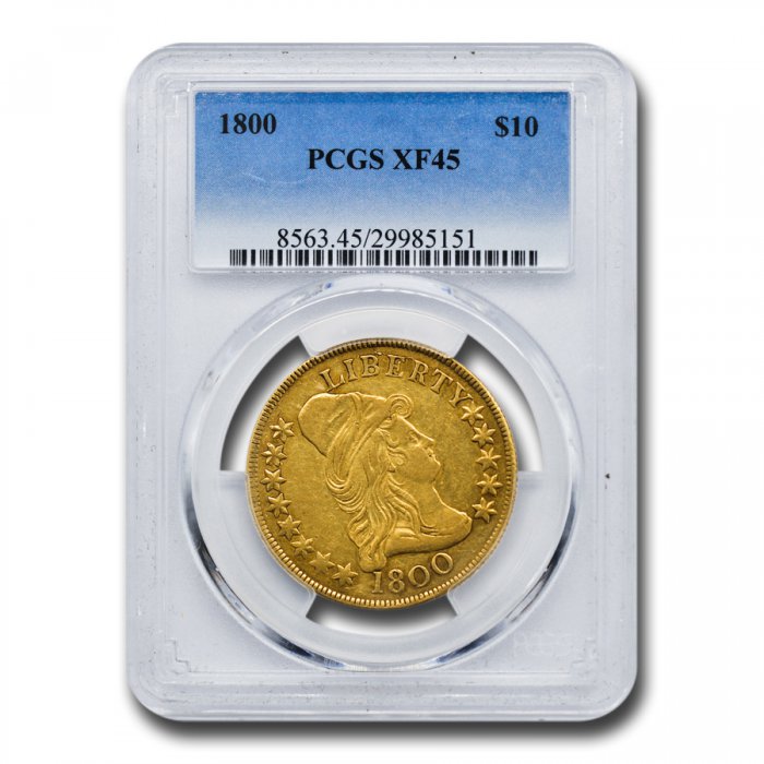 This 1800 $10 Draped Bust Gold Eagle has been certified as XF-45 by PCGS, one of the top two coin grading services. This coin has a population of only 18 coins!