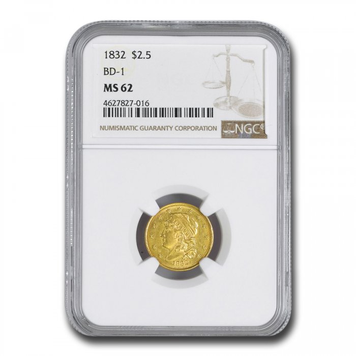 This 1832 $2.50 Gold Capped Bust Quarter Eagle (BD-1) has been certified as MS-62 by NGC, one of the top two coin grading services.