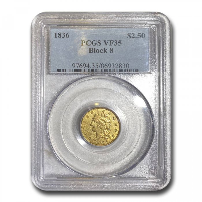 This 1836 $2.50 Gold Classic Head Quarter Eagle (Block 8) has been certified as VF-35 by PCGS, one of the top two coin grading services. This coin has a population of only 33 coins!