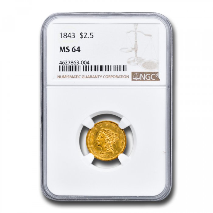 This 1843 $2.50 Liberty Gold Quarter Eagle has been certified as MS-64 by NGC, one of the top two coin grading services.