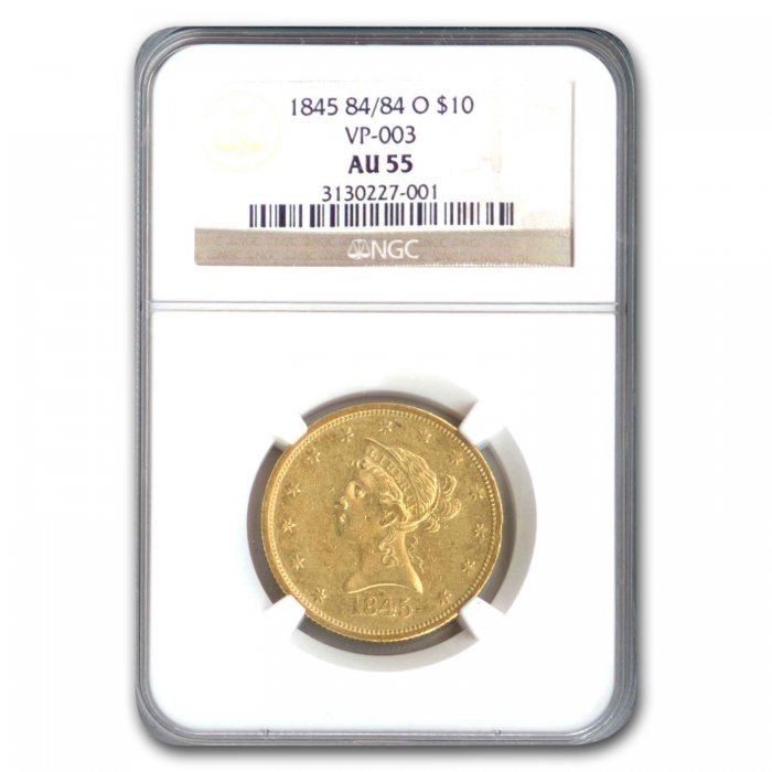 This 1845 84/84-O $10 Liberty Gold Eagle (VP-003) has been certified as AU-55 by NGC, one of the top two coin grading services. This coin has a population of only 62 coins!