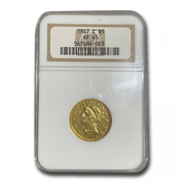 This 1847-C $5 Liberty Gold Half Eagle has been certified as XF-45 by NGC, one of the top two coin grading services. This coin has a population of only 47 coins!