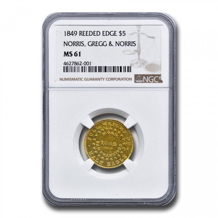 This 1849 $5 Half Eagle Norris, Greg & Norris California Gold Half Eagle has been certified as MS-61 by NGC, one of the top two coin grading services.