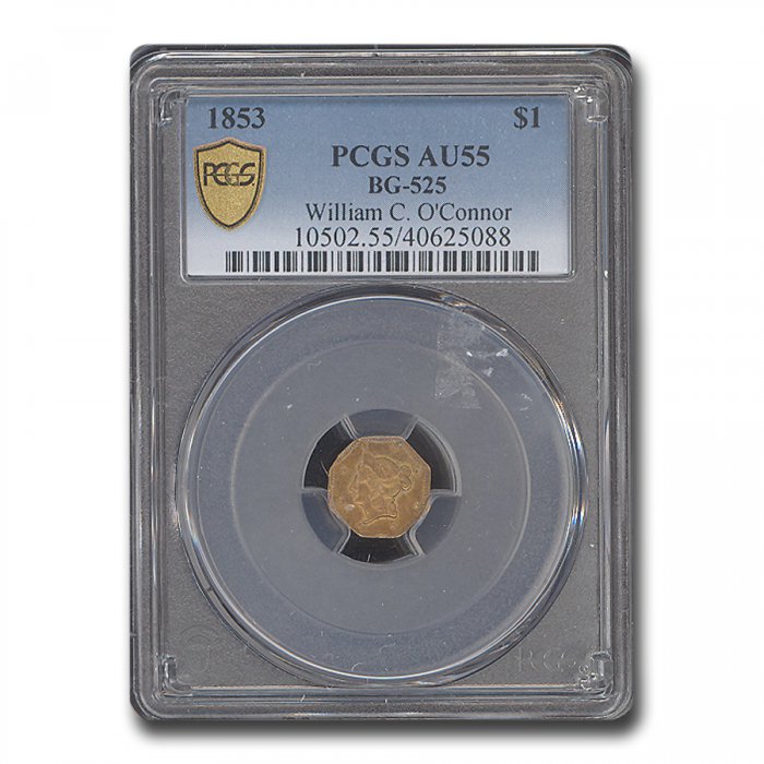 This 1853 Liberty Octagonal One Dollar Gold (BG-525) has been certified as AU-55 by PCGS, one of the top two coin grading services. This coin has a population of only 3 coins!