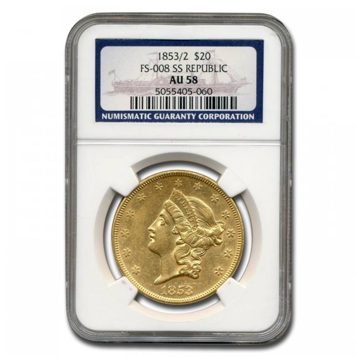 This 1853/2 $20 Liberty Gold Double Eagle (FS-008, SS Republic) has been certified as AU-58 by NGC, one of the top two coin grading services. This highly collectible coin is a great addition to any numismatic collection!