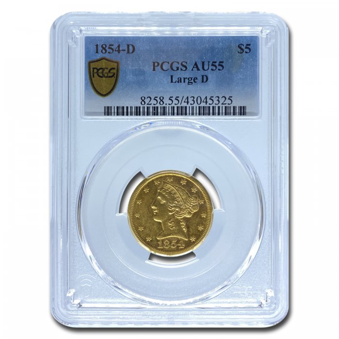 This 1854-D $5 Liberty Gold Half Eagle (Large D) has been certified as AU-55 by PCGS, one of the top two coin grading services. This coin has a population of only 29 coins!