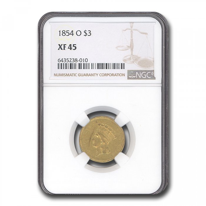 This 1854-O $3 Gold Princess has been certified as XF-45 by NGC, one of the top two coin grading services. This coin has a population of only 164 coins!