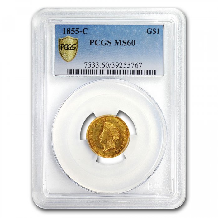 This 1855-C $1 Indian Head Gold has been certified as MS-60 by PCGS, one of the top two coin grading services. This coin has a population of only 2 coins!