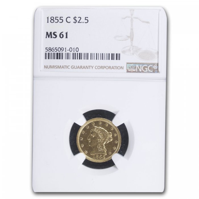 This 1855-C $2.50 Liberty Gold Quarter Eagle has been certified as MS-61 by NGC, one of the top two coin grading services.