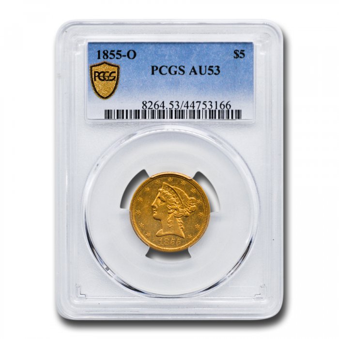 This 1855-O $5 Liberty Gold Half Eagle has been certified as AU-53 by PCGS, one of the top two coin grading services. This coin has a population of only 11 coins!