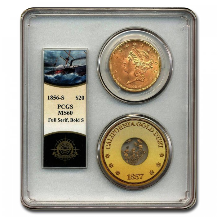 This 1856-S $20 Liberty Gold Double Eagle (Full Serif, Bold S) has been certified as MS-60 by PCGS, one of the top two coin grading services. This coin has a population of only 3 coins!