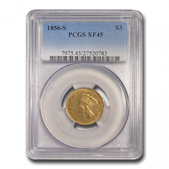 This 1856-S $3 Gold Princess has been certified as XF-45 by PCGS, one of the top two coin grading services. This coin has a population of only 107 coins!