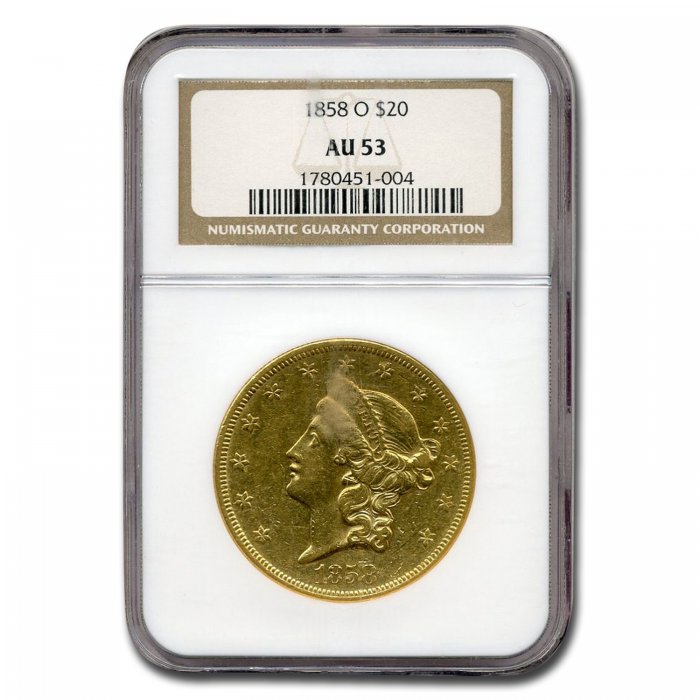 This 1858-O $20 Liberty Gold Double Eagle has been certified as AU-53 by NGC, one of the top two coin grading services. This coin has a population of only 26 coins!