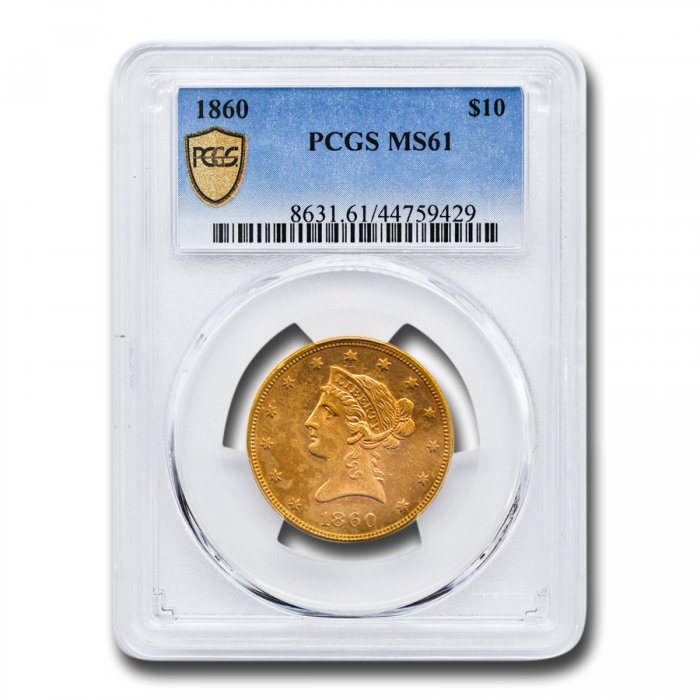 This 1860 $10 Liberty Gold Eagle has been certified as MS-61 by PCGS, one of the top two coin grading services. This coin has a population of only 8 coins!