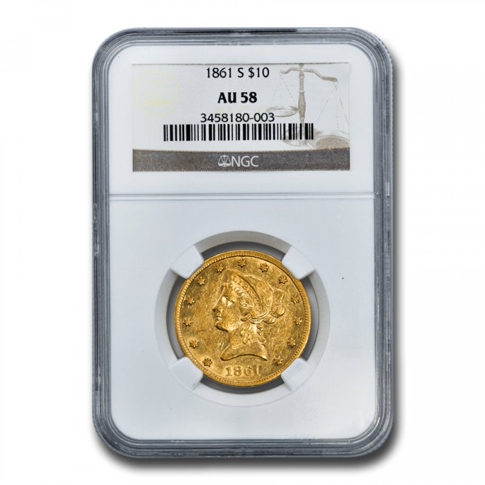 This 1861-S $10 Liberty Gold Eagle has been certified as AU-58 by NGC, one of the top two coin grading services. This coin has a population of only 13 coins!