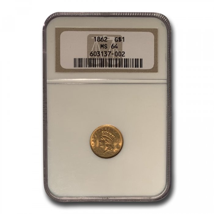 Only $1,159.00 per coin This 1862 $1 Indian Head Gold has been certified as MS-64 by NGC, one of the top two coin grading services. This highly collectible coin is a great addition to any numismatic collection!