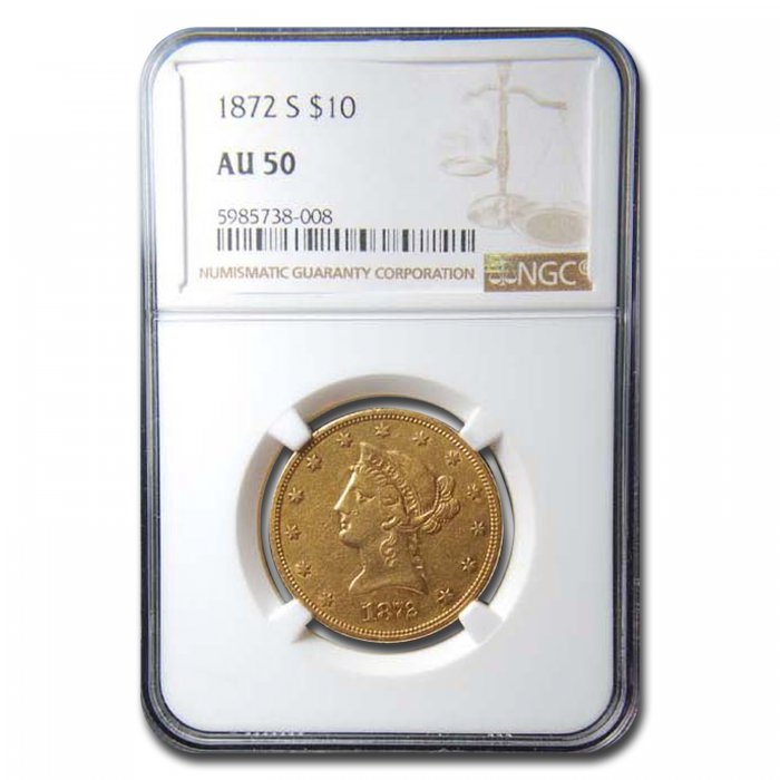 This 1872-S $10 Liberty Gold Eagle has been certified as AU-50 by NGC, one of the top two coin grading services. This coin has a population of only 18 coins!