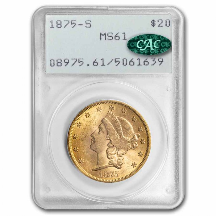 This 1875-S $20 Liberty Gold Double Eagle has been certified as MS-61 by PCGS, one of the top two coin grading services. This highly collectible coin is a great addition to any numismatic collection!