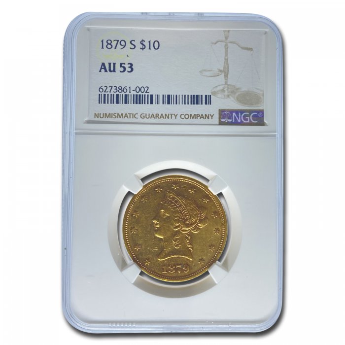 This 1879-S $10 Liberty Gold Eagle has been certified as AU-53 by NGC, one of the top two coin grading services. This coin has a population of only 24 coins!
