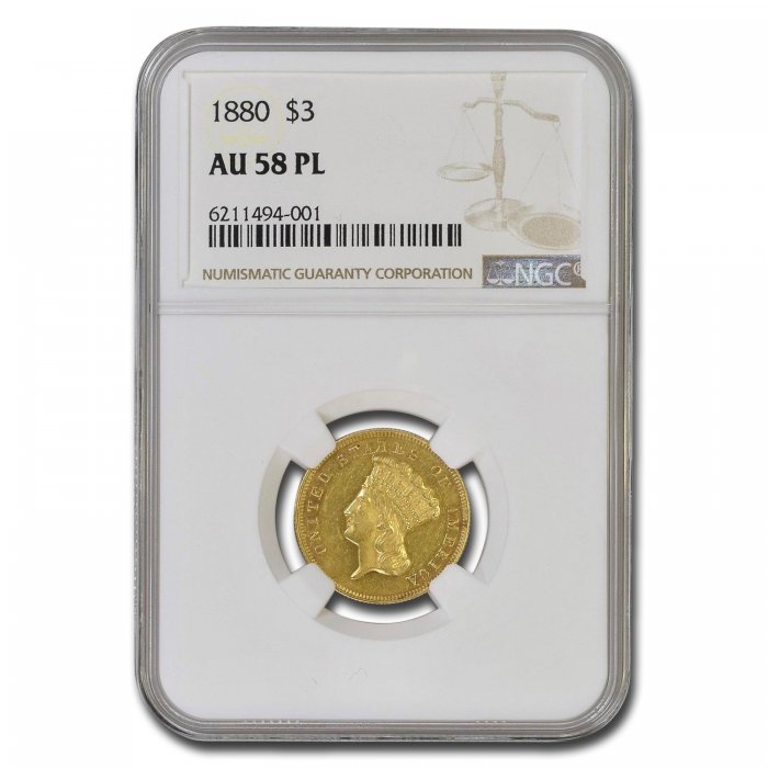 This 1880 $3 Gold Princess has been certified as AU-58 (PL) by NGC, one of the top two coin grading services. This coin has a population of only 1 coin!
