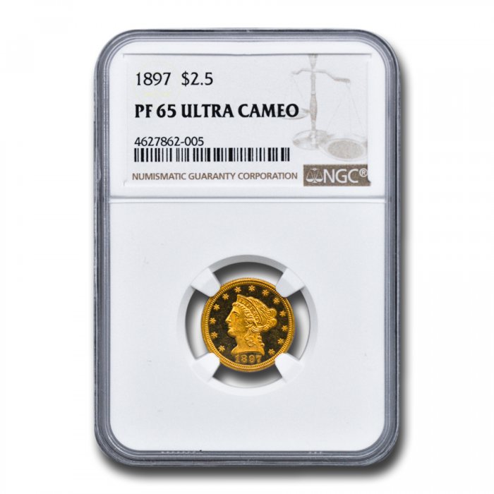 This 1897 $2.50 Liberty Gold Quarter Eagle has been certified as PF-65 UCAM by NGC, one of the top two coin grading services.
