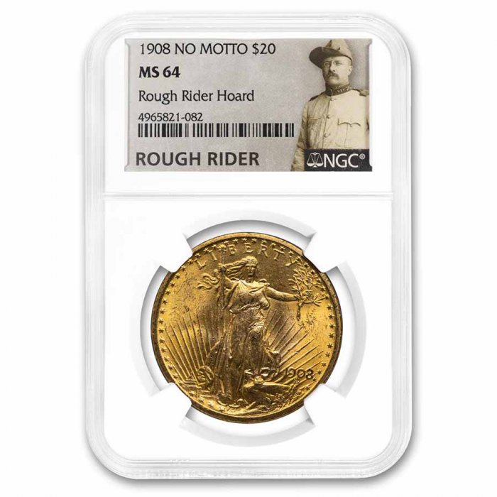 The Rough Rider hoard was found in Europe and contained 1907 and 1908 Saints. Teddy Roosevelt hired Augustus Saint-Gaudens to redesign the United States coinage because he deemed the designs "atrocious". After public outcry, "In God We Trust" was added.