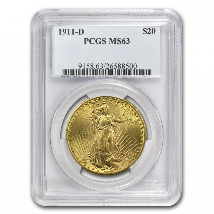 Considered to be America's most beautiful coin, this $20 Gold coin was designed by sculptor Augustus Saint-Gaudens. This Denver mint $20 Gold Double Eagle has been authenticated and graded as Choice Brilliant Uncirculated MS-63 by PCGS.