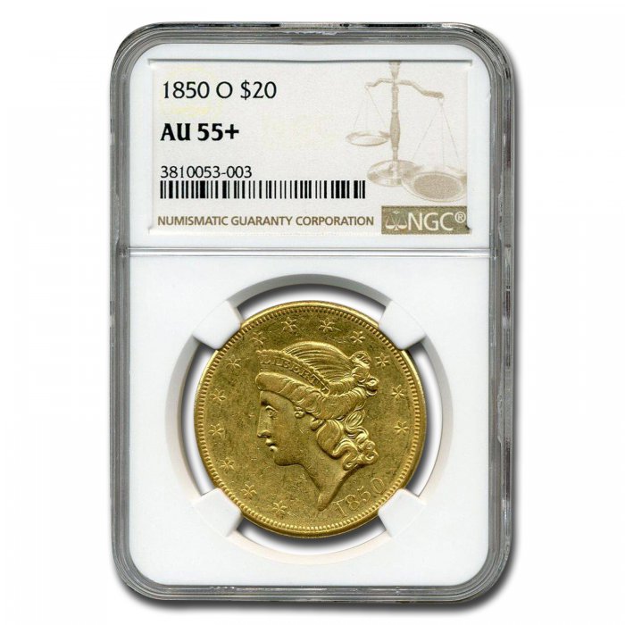 This 1850-O $20 Liberty Gold Double Eagle has been graded by NGC as a collectible AU-55+. This coin has a population of only 1!