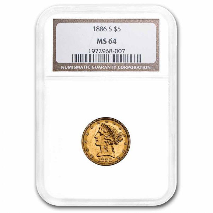 The $5 Liberty Gold Half Eagle coins were designed by Christian Gobrecht and were minted from 1838-1907. NGC has graded this coin an MS-64, meaning its beautiful design has survived the test of time.