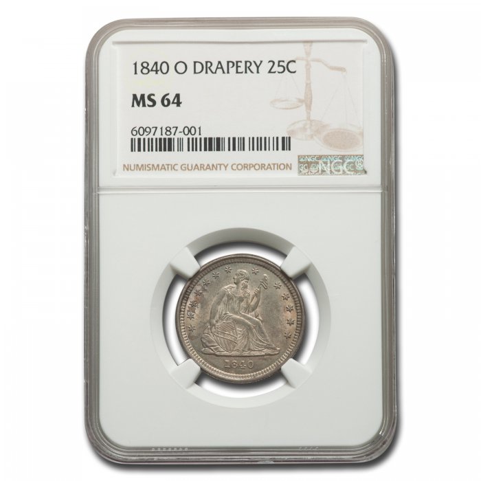 This 1840-O Liberty Seated Quarter (Drapery) has been certified as MS-64 by NGC, one of the top two coin grading services. This coin has a population of only 6 coins!