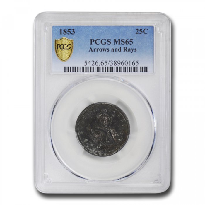While part of a plentiful mintage, the arrows & rays quarter has always brought strong prices, as it is a one-year type and thus holds strong appeal for collectors. This MS-65 example is near top-pop at PCGS, with only 13 coins graded higher.
