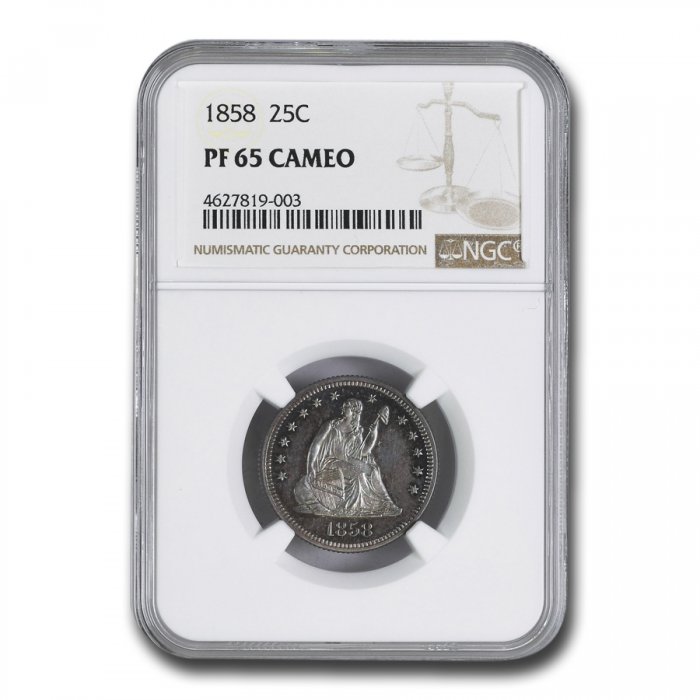 This 1858 Liberty Seated Quarter has been certified as PF-65 Cameo by NGC, one of the top two coin grading services.