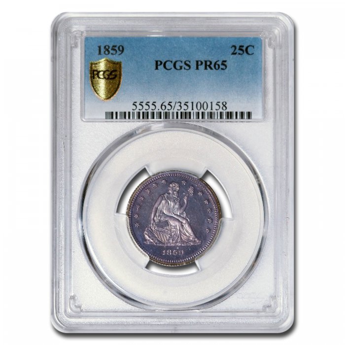 This 1859 Liberty Seated Quarter has been certified as PR-65 by PCGS, one of the top two coin grading services.