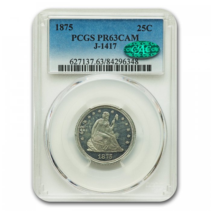 This 1875 Liberty Seated Quarter Pattern has been certified as PR-63 Cameo by PCGS, one of the top two coin grading services. This coin has a population of only 1 coin!