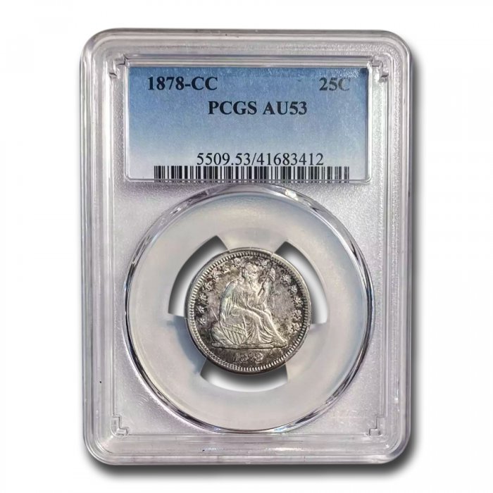 This 1878-CC Liberty Seated Quarter has been certified as AU-53 by PCGS, one of the top two coin grading services. This coin has a population of only 15 coins!