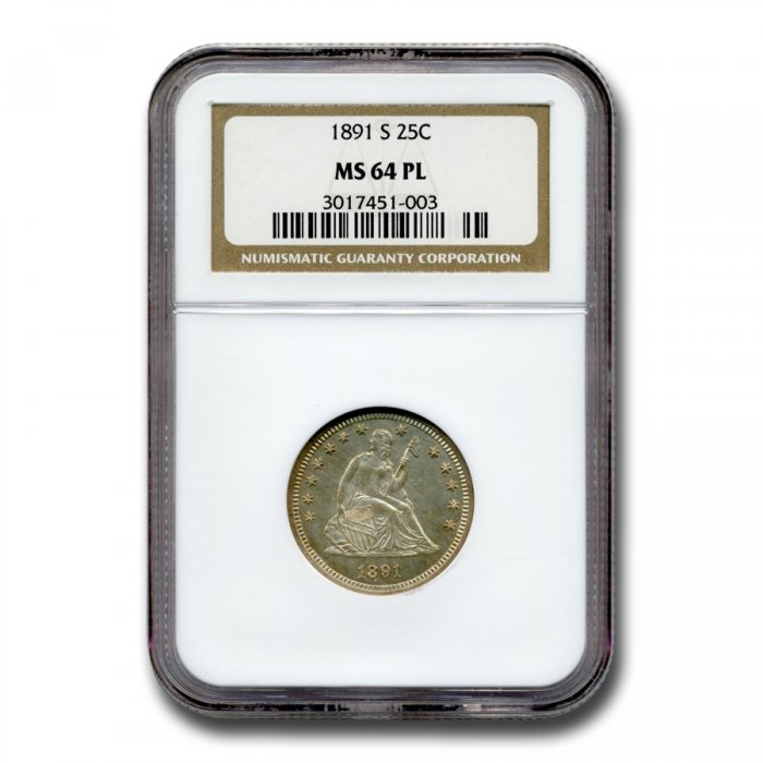 This 1891-S Liberty Seated Quarter has been certified as MS-64 (PL) by NGC, one of the top two coin grading services. This coin has a population of only 2 coins!