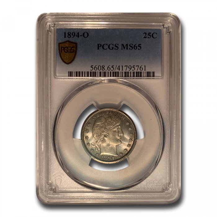 This 1894-O Barber Quarter has been certified as MS-65 by PCGS, one of the top two coin grading services. This coin has a population of only 9 coins!