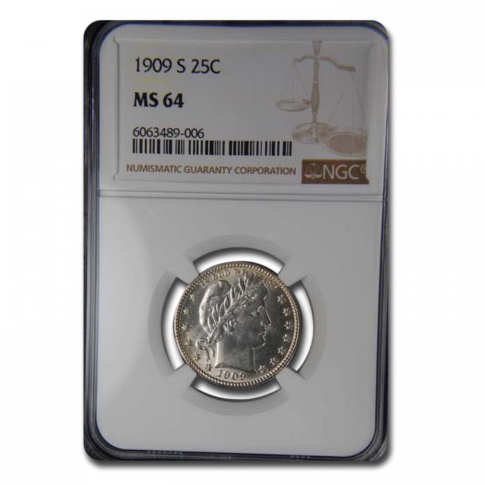 Only $1,379.00 per coin This 1909-S Barber Quarter has been certified as MS-64 by NGC, one of the top two coin grading services. This coin has a population of only 25 coins!