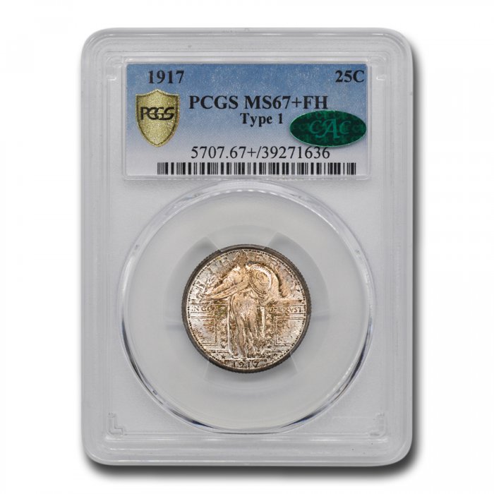 This 1917 Standing Liberty Quarter Type-I has been certified as MS-67+ (FH) by PCGS, one of the top two coin grading services. This coin has a population of only 19 coins!